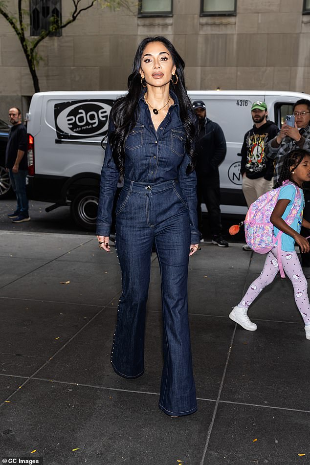 Nicole Scherzinger, 46, was spotted looking stylish and confident while grabbing dinner at Via Carota restaurant in NYC. She wore a denim jumpsuit that cinched her waist, beige suede heeled boots, and statement gold jewelry. The singer appeared to be enjoying herself before getting into a taxi to head home, as she has been spending time in the city for her lead role in Andrew Lloyd Webber’s production of Sunset Boulevard.